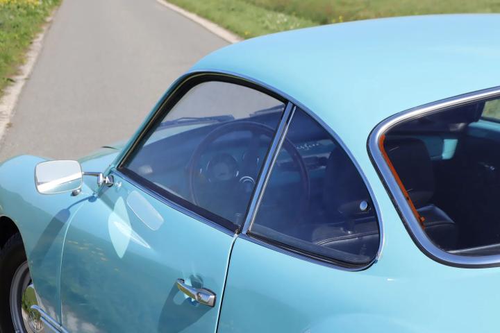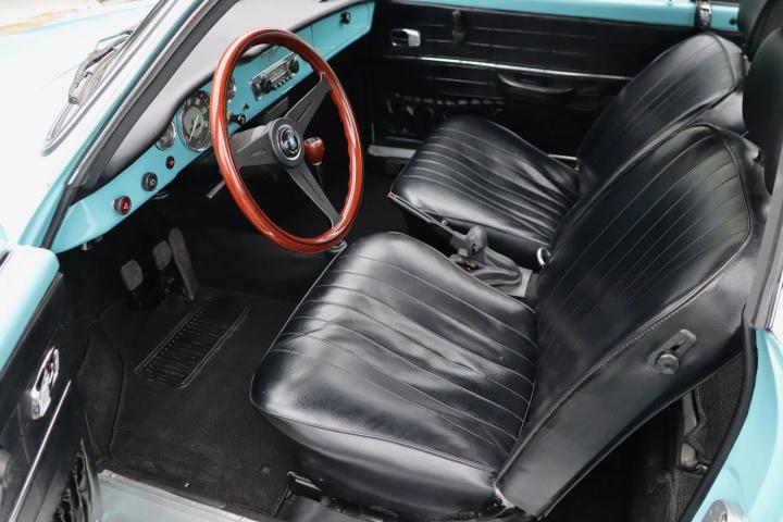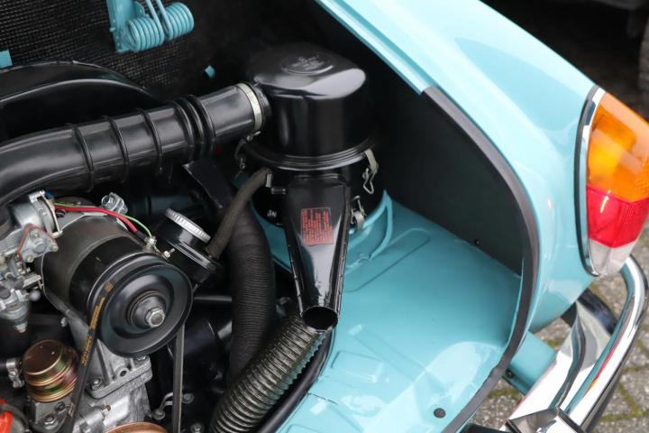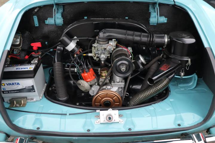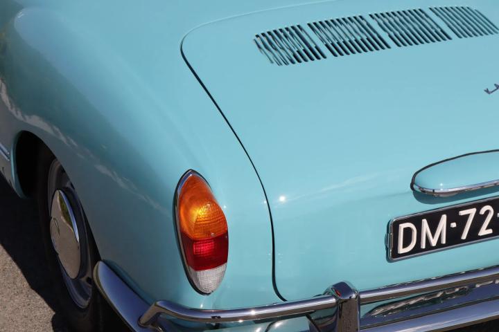 The car is in virtually the same condition as when it rolled off the production line in Osnabrück. It stands out in terms of the colour of the paintwork: this is a unique Aston Martin colour that is unique to this car. Both the paintwork and the chrome work, rubbers and rims are in very good to perfect condition. Naturally, the car is rust-free and the underside is in good condition. The interior features black (artificial) leather upholstery and a wooden Nardi steering wheel. A distinctive feature of the car is the lockable glove compartment. The interior has also been restored to its original condition and is in very good condition. The original radio is still present. Thanks to the rear seat, a total of four people can be seated. The boot (at the front) is also neat and tidy and has room for the spare wheel.