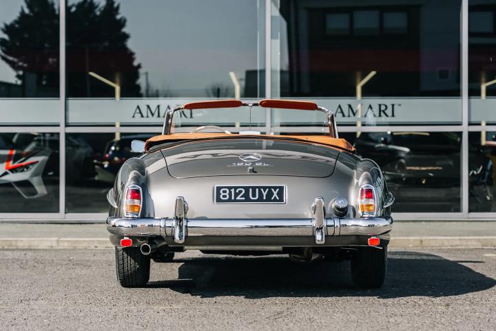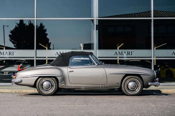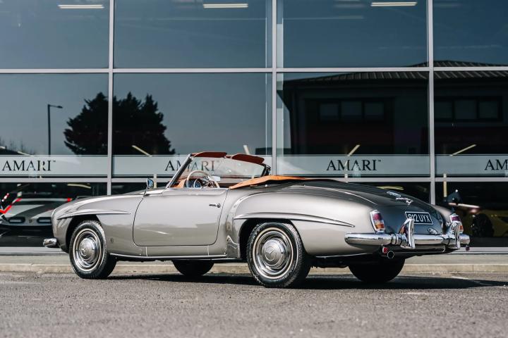 The 1959 Mercedes-Benz 190 SL is a classic roadster that epitomizes the elegance and engineering excellence of its era. This particular model, currently available for sale, has undergone a meticulous restoration by the renowned German company, Arthur Bechtel Classic Motors, ensuring it is presented in pristine condition. The vehicle boasts a sophisticated Anthrazit exterior complemented by a luxurious Cognac leather interior. Having been registered with the UK's Driver and Vehicle Licensing Agency (DVLA) in September 2017, it has since been driven a mere 88 miles, effectively rendering it in near-new condition. As a left-hand drive model, it retains its original driving configuration, appealing to purists and collectors alike.