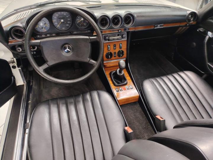The black MB-Tex interior and white exterior are both very well preserved, highlighting the timeless elegance of the R107 design.