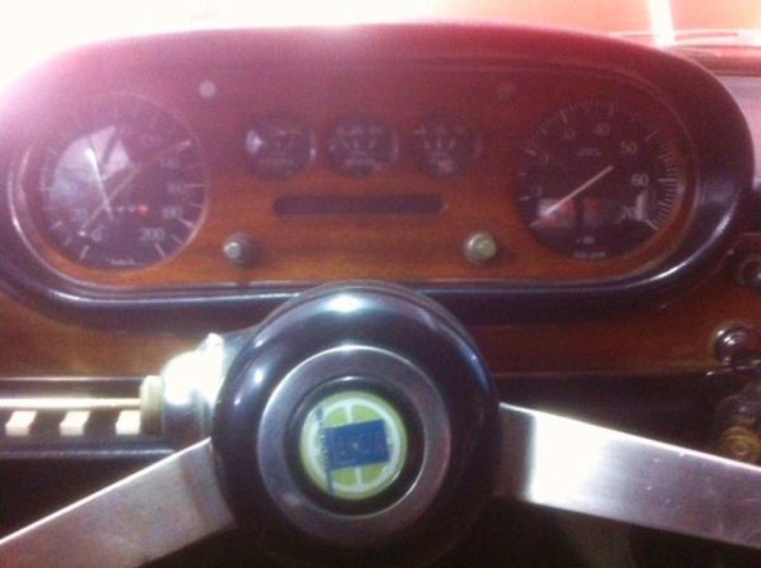 Deze Flavia is voorzien van gele koplampen, mooi bij de rode lak en eveneens een rood lederen interieur. heeft houten dashbord met grote ronde tellers, originele Lancia velgen.